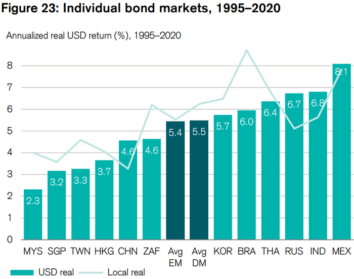 Так же интересен тот факт, что развивающиеся рынки акций отстают от развитых на 1% годовых, из-за того, что развивающиеся испытывают куда более глубокие и тяжелые просадки во время кризисов. Также, стоит держать в уме, что между кризисами развивающиеся рынки часто показывали опережающую динамику над развитыми.