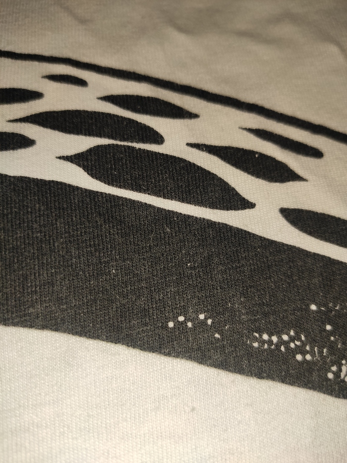 Причем на ощупь чувствуется наличие пропитки ткани, футболка кажется более плотной чем должна быть, рисунок отливает глянцем, материал не склонен сильно мяться.