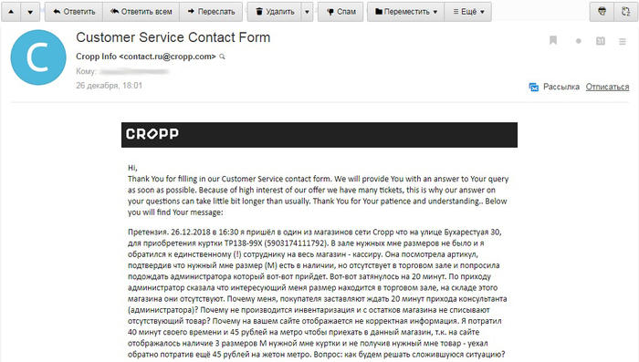 К чему это я всё пишу? Я в а**е от того что произошло. Я прекрасно понимаю что Cropp - это молодёжная сеть одежды. Сеть созданная распизьдяеми, в которой работают распиздяи и продают распиздяйскую одежду для распиздяев. Но мать вашу! Вы знаете что такое инвентаризация и как её делать? Вы знаете что такое 1С и как ее связать с остатками на сайте?