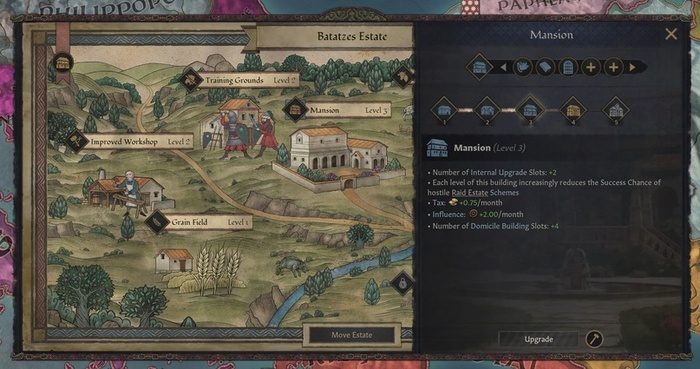 В административной державе значение имеют семьи дворян, то есть их Дома. Глава каждого Дома имеет доступ к поместью, которое представляет собой общее богатство семьи и любые небольшие участки земли, которыми они могут владеть. Хотя благородная семья может и не занимать губернаторских постов, они все равно являются влиятельными дворянами, владеющими значительным количеством недвижимости. Поместье имеет двоякую цель: оно дает вам власть, на которую вы можете положиться в любой момент, выступая в роли вашего дома и места, где проживает ваш персонаж, когда у вас нет других титулов. Во-вторых, оно существует как средство развития, которое вы можете приспособить к своим потребностям и стилю игры. Поместье дает вам доступ к целой куче зданий и улучшений, предоставляя различные бонусы, открывая новые взаимодействия или решения, а также улучшая существующий набор инструментов различными способами. Несомненно, это один из основных источников повышения вашего Влияния.
