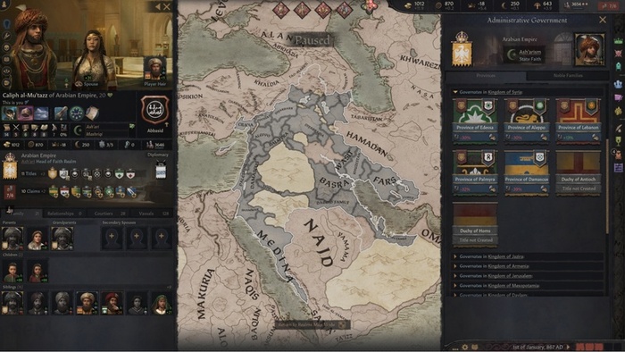 Губернаторы — это основа бюрократической державы. Чтобы проще было наблюдать за губернаторами, мы сделали новое окно державы. Здесь можно увидеть каждого губернатора, насколько они хороши, к какой семье они принадлежат и кто им наследует. Мы хотим, чтобы вы могли получить общее представление не только о державе в целом, но и о том, какие фемы вы можете создать, а какие фемы уже контролирует ваша собственная династия. Будучи вассалом, вы будете иметь быстрый доступ к некоторым общим действиям, которые предпринимаются по отношению к императору.
