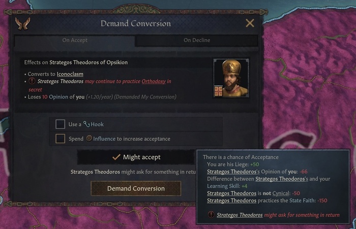 Такой подход — классика Crusader Kings. Настоящий же византийский политик пойдёт по более высокому пути и заставит этого губернатора отказаться от полномочий или воспользуется новыми происками по очернению, чтобы загнать его репутацию под землю.