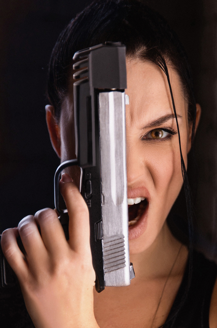 Понятное дело, что обойтись без образа из первого фильма было решительно невозможно. Претензии по пальцу на спусковом крючке (на фото ниже) не принимаю, потому что за основу брала оригинальное фото, где у актрисы так же лежит палец.