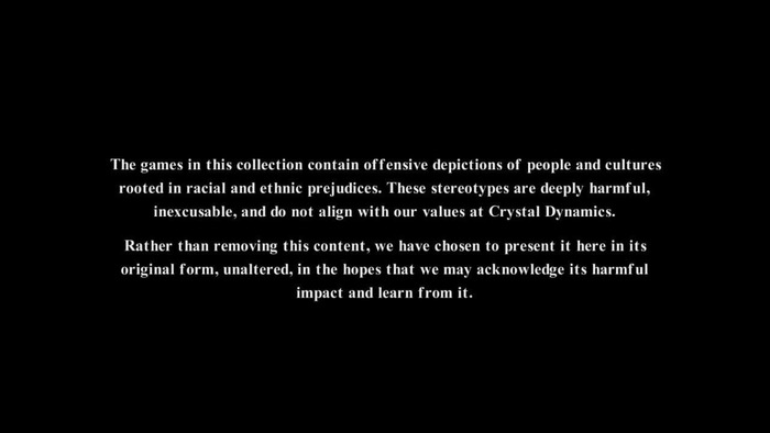 «Игры из этой коллекции содержат оскорбительные изображения людей и культур, основанные на расовых и этнических предрассудках. Эти стереотипы глубоко вредны, непростительны и не соответствуют нашим ценностям в Crystal Dynamics. Вместо того, чтобы удалять этот контент, мы решили представить его здесь в исходной форме, без изменений, в надежде, что мы сможем осознать его вредное воздействие и извлечь из него уроки»