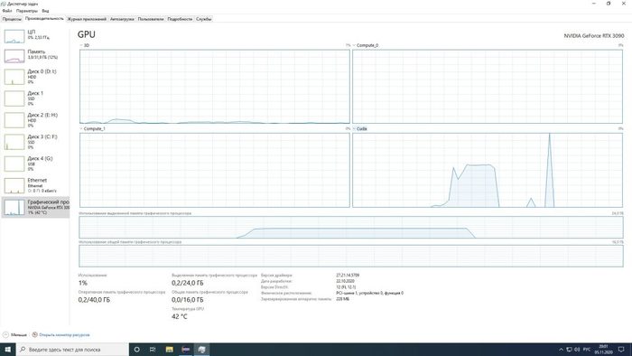 На первом графике видно, как задействуется память видеокарты и ресурсы GPU при обучении Convolution 1D — сверточной одномерной сети, обрабатывающей временные ряды — данные исследований ЭЭГ. Ранее обучение нейронной сети на этом датасете занимало около 4 часов. На новой видеокарте — порядка 3-4 секунд.