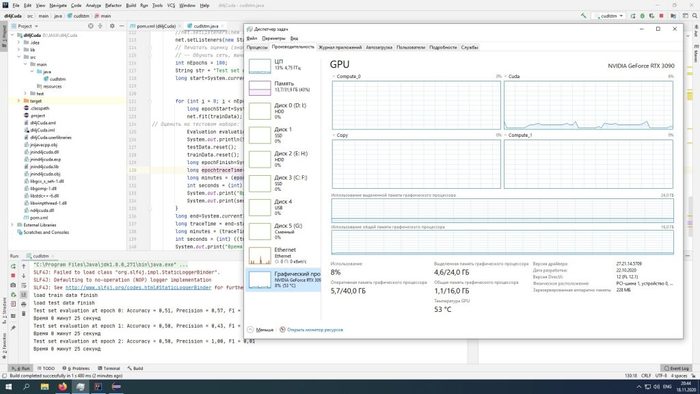 Что и обусловило компиляцию недостающих файлов. К счастью, версия deeplearniung4j для 11.0 версии CUDA импортировалась, и, добавив в проект в виде отдельных jar и dll файлов скомпилированные библиотеки, удалось запустить приложение на видеокарте!