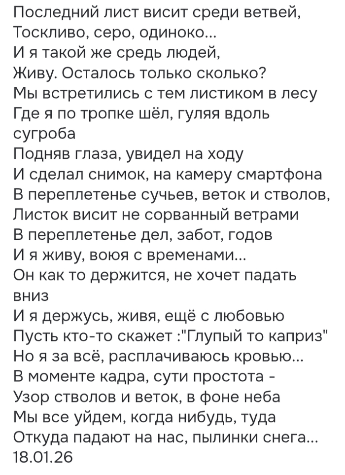 Дом-работа- ужин сон и так много лет по кругу в высоком темпе. Однажды, наступает момент, когда более не нужно бежать, дети выросли, есть скромные накопления, но человек бывает не готов к смене окружения, рода занятий, да просто даже, порой, не знает и не умеет расслабляться.Некоторые в такой ситуации ищут то самое « расслабление» на дне гранёного стакана, а он, стакан, лучший друг доселе незнакомых инсульта и инфаркта, есть категория людей, которые просто приклеиваются к своим детям, категорически не давая им жить самостоятельно, пытаясь во всем помочь, наставить, поправить- как правило, это тоже ни к чему хорошему не приводит, особенно для детей. Мой товарищ переехал в Подмосковье на землю, дав тем самым возможность дышать и себе и своим детям.Алкоголь не сказать , что категорически не употребляет. Бывает, своё вино, сделанное из винограда сорта Изабелла, посаженного и выращенного своими руками. В охоточку, на праздник с рыбкой- мило дело. Дом и участок- это не место для ленивых, как сейчас модно говорить диванных строителей и садоводов. В тёплое время года траву покоси, крыльцо поправь, грядки, теплица, сад- каждый день есть дела, но не так чтобы, сломя голову, с чувством, толком и расстановкой. Наши деревни находятся по соседству, и от Николая я перенял одно хорошее увлечение- каждый вечер мы устраиваем прогулки вдоль леса и по деревням, минимум 4 км. Опять же, никто себя не загоняет, ходим в своё удовольствие. Надо птичку сфотографировать-остановка, небом полюбоваться- остановка, петь хочется- идем поем, стихи читаем, и пусть хоть весь мир крутит пальцем у виска. В нашем районе есть Святой Источник, вот сегодня, в канун Крещения ездили за водичкой, Николай и на роднике людям стихи читал, там один мужик с похмелья чуть не поперхнулся, а мы ему , что если будет в таком месте материться, то Боженька язычок то укоротит, он не понял, ну поймёт, всему своё время. Так дни интересно проходят, независимо от времени года- постоянно есть, чем заняться, а тёмным , морозным январским вечером мы садимся за комьютер и пишем свои стихи и рассказы -Николай в своей деревне,я в своей, а потом, во время прогулки, обсуждаем, что получилось, что нет. На следующей неделе, даст Бог, баню надо затопить, Николая приглашу, он большой любитель попарится, будем однозначно пить чай с мятой, мелиссой и мёдом, да маленькими глоточками после парилки- ой как хорошо он заходит, а настроение просто класс.Да, а водичка то в чае будет непростая, со Святого Источника.