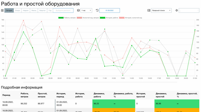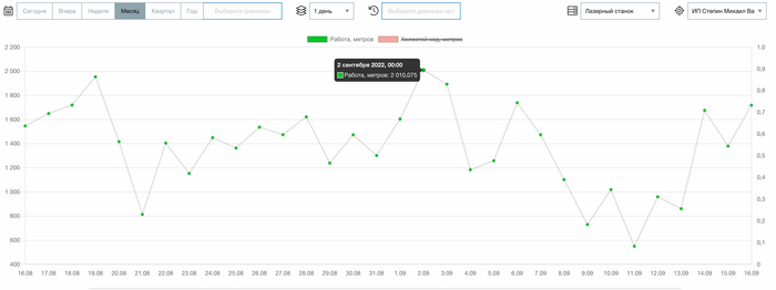 В чем считать производительность (эффективность). Здесь у каждого свое мнение, но так как станок режет метры, то логично метры и смотреть. Все учтено по метрам. На графике месяц и это загрузка станка.