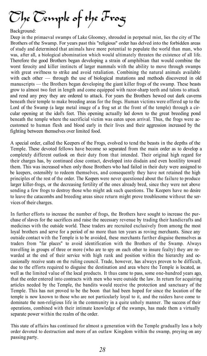 Благодаря экспериментам монахов лягушки стали вырастать почти до двух футов в длину и были оснащены бритвенно‑острыми зубами и когтями, чтобы атаковать и растерзывать любую добычу, на которую им прикажут напасть. Годами члены Братства вырубали тёмные пещеры под своим храмом, чтобы обустроить в них все необходимые условия для разведения лягушек‑убийц.