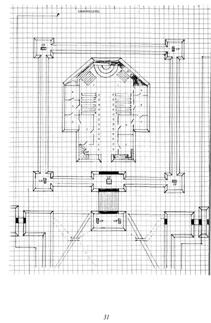 главный вход расположен вдоль восточной стены: дверь 6′×3′ ведёт к лестнице, поднимающейся на верхние этажи;