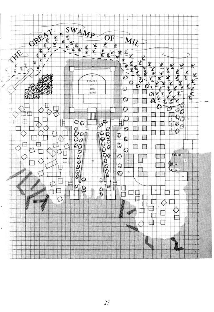 Перед храмом теперь раскинулся обширный сад, тянущийся до открытой воды; его фланкирует массивная стена с башнями на обоих концах — для защиты подступов к храму со стороны болота.
