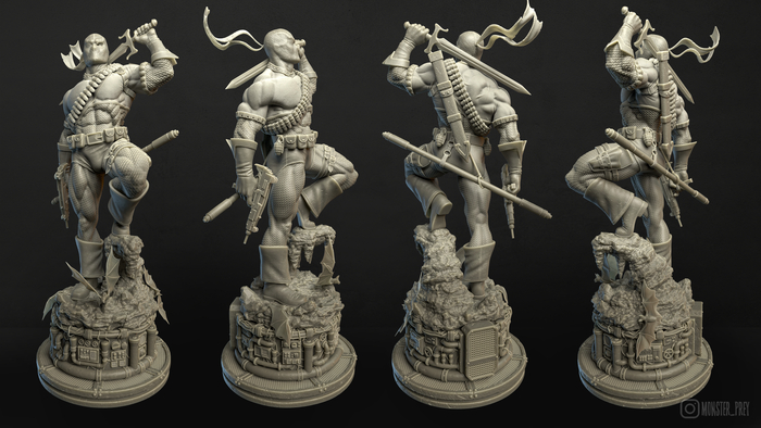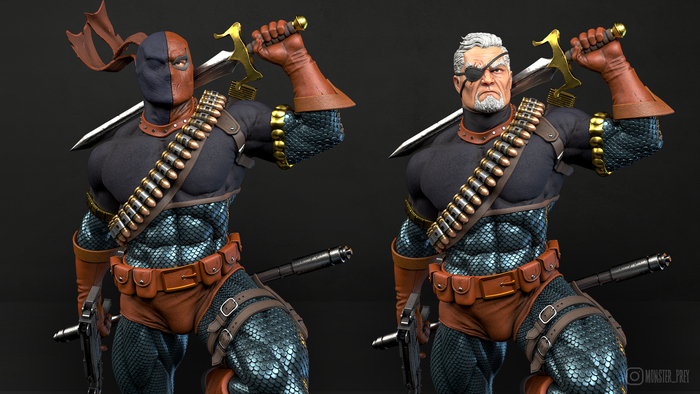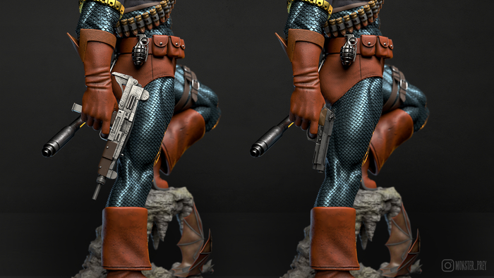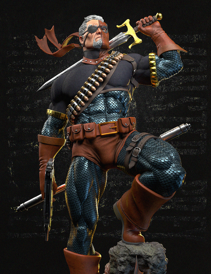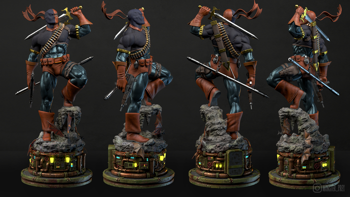 На создание этой скульптуры меня вдохновил фан-арт, найденный в интернете. К сожалению, я не знаю имени автора. Он подошёл идеально, потому что я хотел сделать статую. Я нашёл много фигурок Дефстроука в интернете, но почти ни одной в музейной позе. И, конечно же, я уделил особое внимание его классическому костюму и снаряжению.