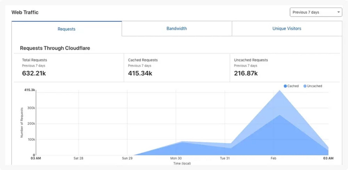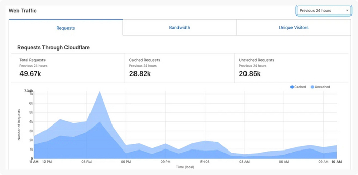 На графике отображён пик атак, и как Cloudflare кэширует запросы.
