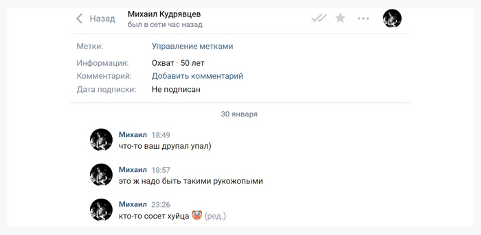 Что же делать? Правильно: забить на всё, пусть поддержка мучается:) Но выходные не вечные и пришлось в понедельник с утра заняться проблемой, так как уже стало понятно, что это кто-то настойчиво DDOSит. Да и в сообществе ВК некий Михаил, а точнее некто под видом Михаила гадости гадкие начал писать, заявляя так сказать о своём «успехе». А лексика всё та же… Ничего новенького…