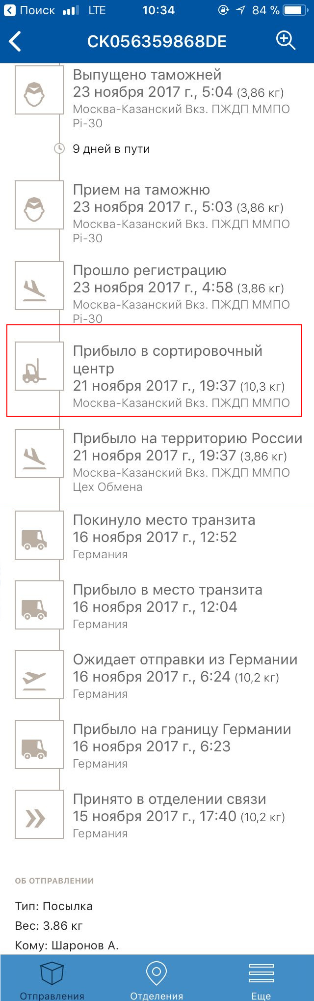 Прибыла на территорию России с одним весом на имя некоего г-на Шаронова, затем сортировка с весом моей посылки, внезапно, и далее уже трекается совершенна другая посылка. В приложении отвечают одни боты.