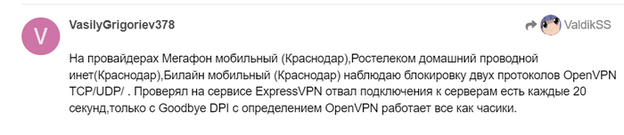 Первые заявления о блокировках появились 30 мая в районе 8 вечера. Пользователи пишут, что блокировка разрывает сессию OpenVPN после нескольких пакетов. Думаю, что DPI анализирует пакеты, узнаёт OpenVPN и разрывает соединение.