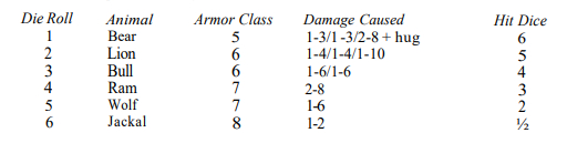 «Козел боя» — вырастает до размеров быка (класс брони 2, кубики здоровья 10, 4 атаки/ход: 2 рога — 2–16 очков урона, 2 копыта — 1–8 очков урона; при атаке дополнительно 5–20 очков урона);