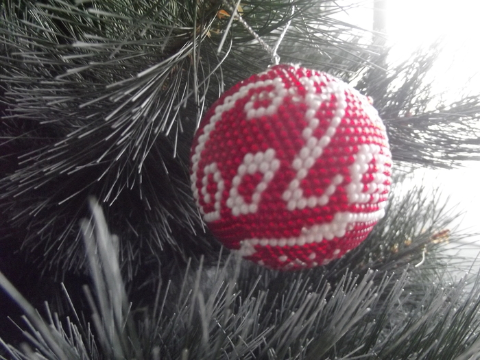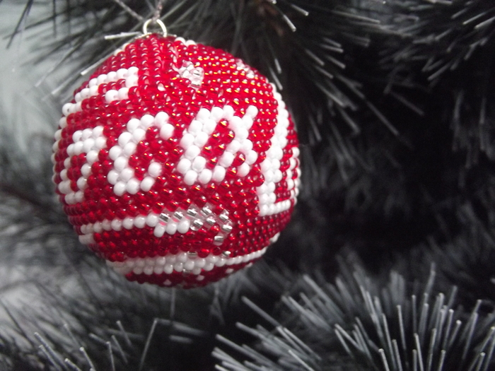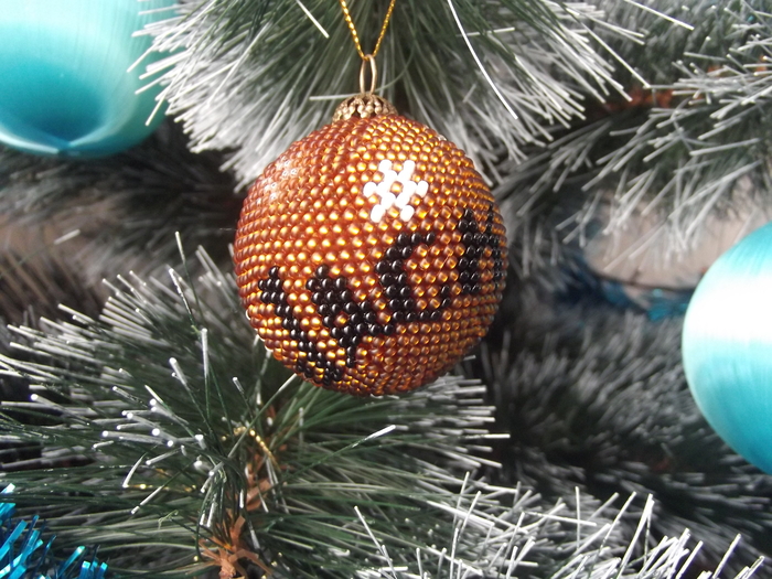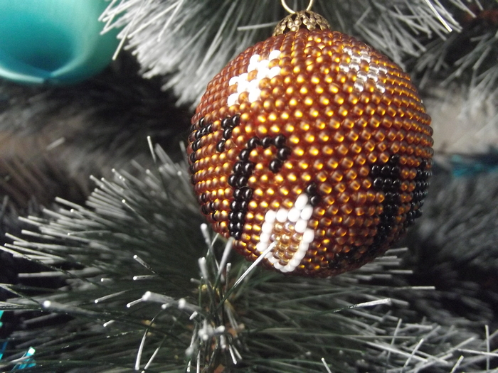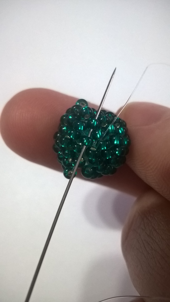 Тут могу сделать маленькую подсказку для тех, кто оплетает бусинку и случайно потерял конец ряда - это может случиться в любой момент работы - обратите внимание, что узор представляем собой зубчики - чередуются бисеринки выше-ниже-выше-ниже. Так вот, подходя к концу ряда, Вы заметите, что бисеринки идут выше-выше, то есть не одна бисеринка выше, а другая -ниже, а 2 бисерины подряд идут вверх. Наглядно на фото смотрим: правее от иглы мои последние в ряду 2 бисерины, потом игла прошла в последнюю бисерину 2-го ряда, а потом идет еще одна бисерина, которая выше. Это и есть начало следующего ряда. Вводим иглу в эту самую высокую бисеринку и начинаем плести 4-й ряд.