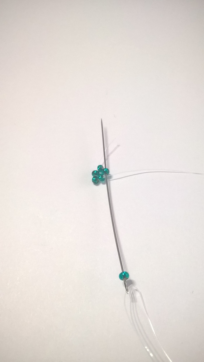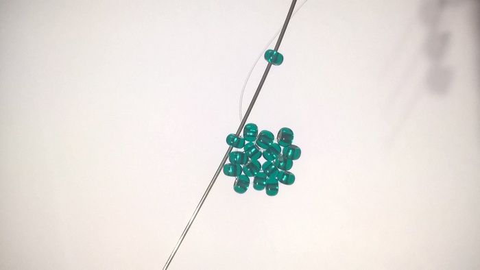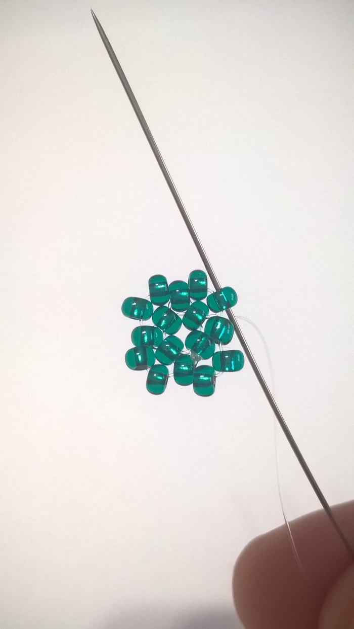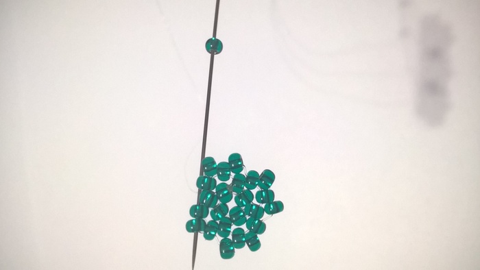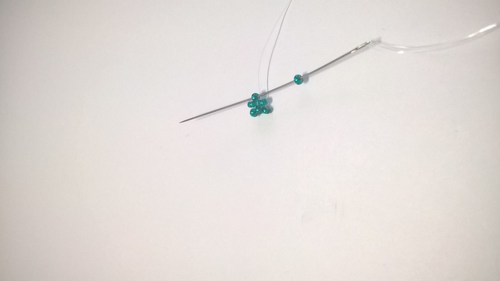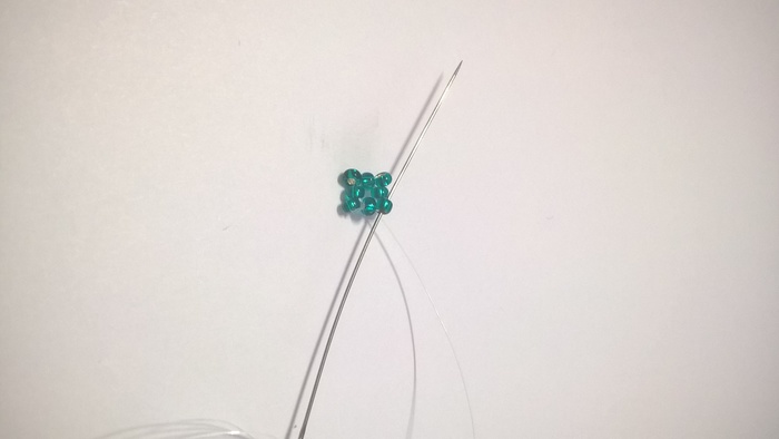 Круг 2. Набираем на нить 1 бисерину и вводим иглу в соседнюю бисеринку: