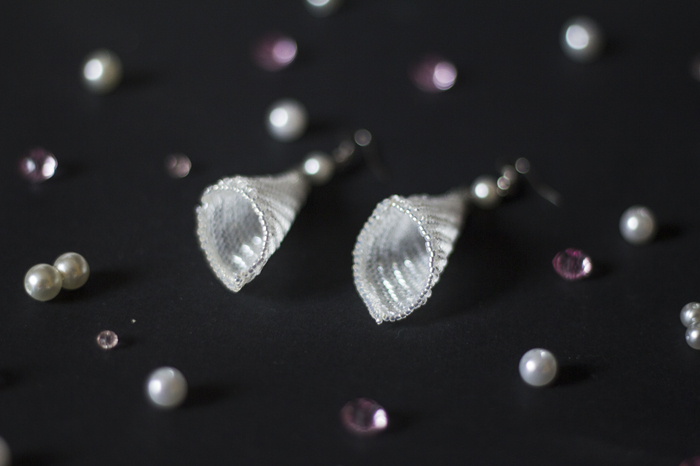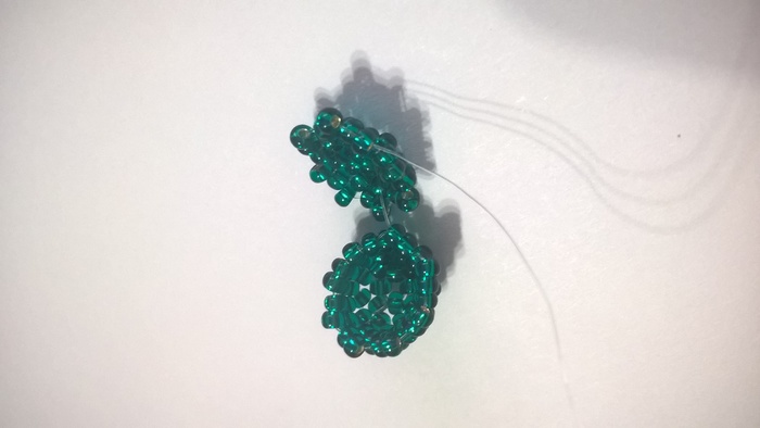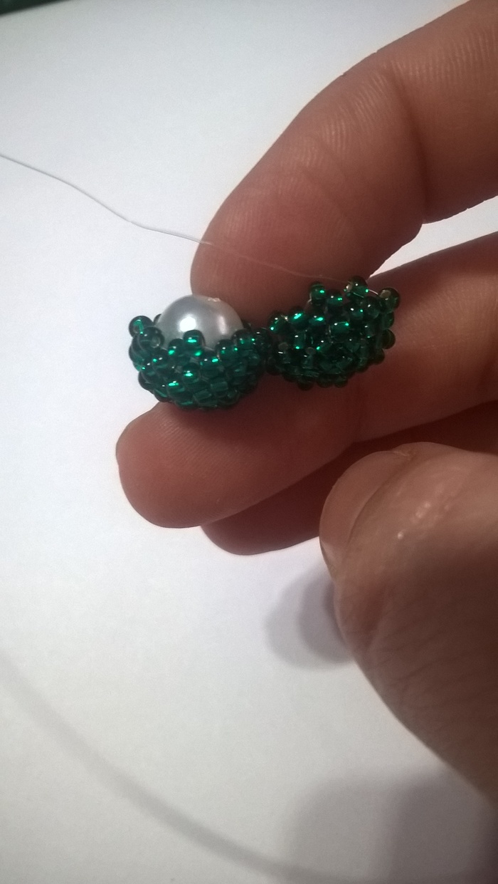 Теперь в большую "шапочку" (или половинку) вставляем нашу бусинку, следим, чтобы отверстие было сверху, придерживаем, чтобы не выскочила, и накрываем "шапочкой". И теперь сшиваем 2 половинки по выступающим бисеринкам: