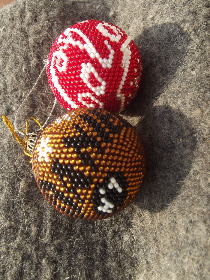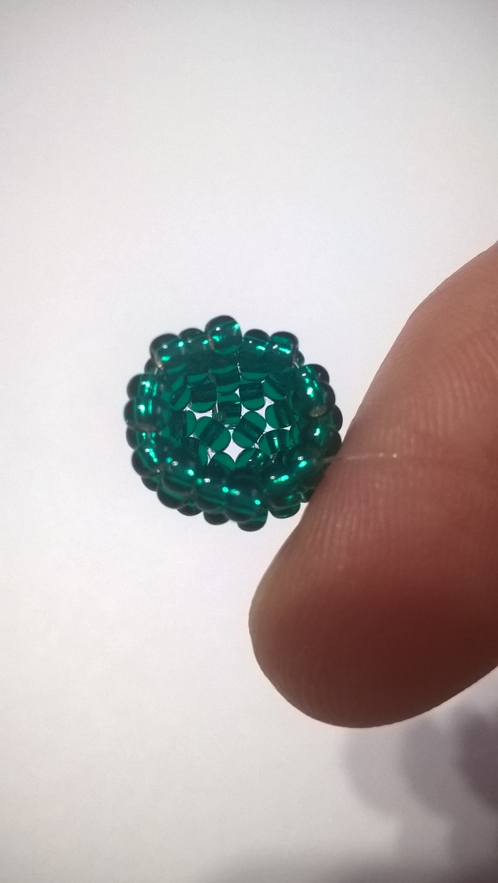 Следите за тем, что когда Вы накроете шапочкой большую половинку, чтобы верхние бисерики одной половинки совпал с нижними бисеринками второй половинки, как мозаика. Поэтому и сшиваете по вытупающим бисеринкам каждой половинки по очереди: После того, как закончите сшивать, пройдите еще несколько рядов нитью, закрепите, потом спрячьте нить. Я вывожу нить в самый верх бусины, делаю узелок, обрезаю, подплавляю слегка. Потом на это место ляжет шапочка для бусины.