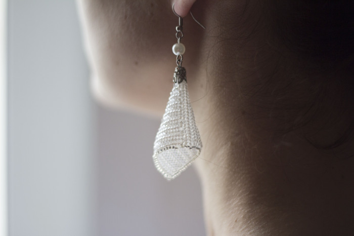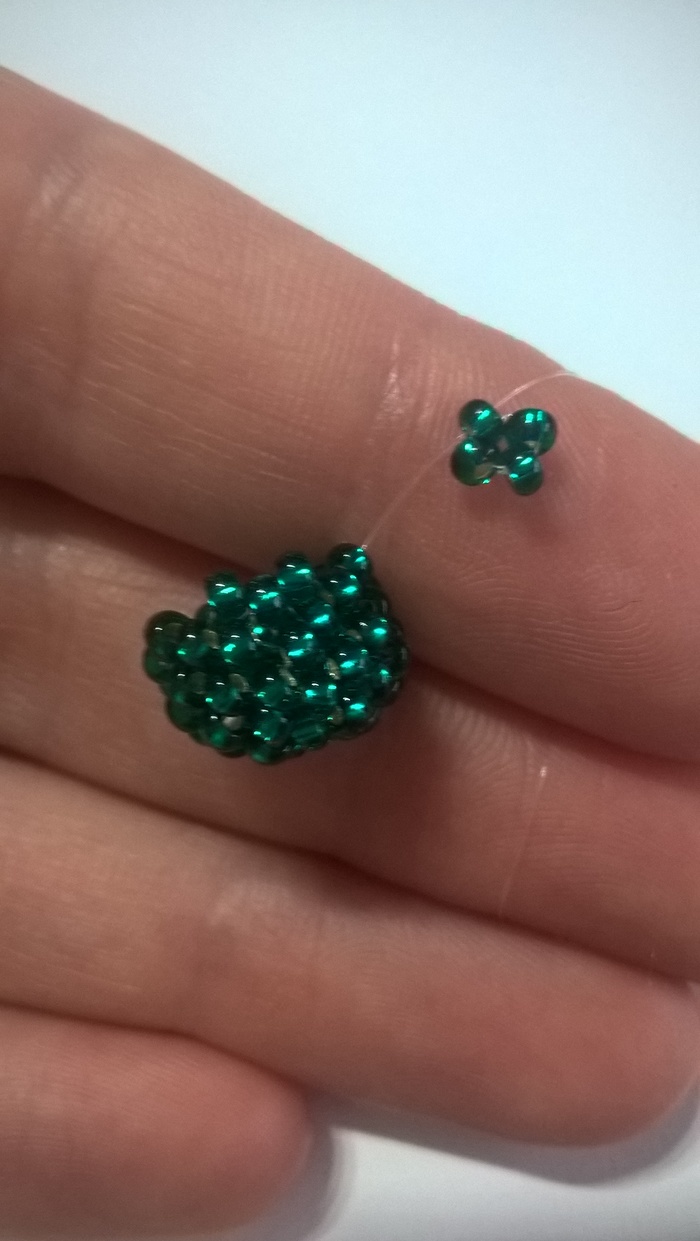 Когда Вы сплели 9-й ряд, выведите иглу на начало 10-го ряда. Теперь наберите на нить 4 бисерины, протяните их почти до конца, и в сантиметре (8-10мм) от нашей "шапочки" затяните крестик (так же, как в начале работы).