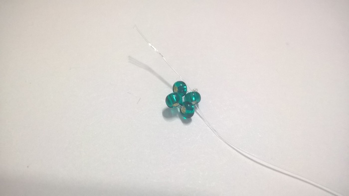 Круг 1. Набираем на нить 4 бисерины, замыкаем их в круг, то есть делаем крестик. Обычно я делаю 3 узелка на леске сразу, но можно сначала набрать бисер, замкнуть в груг, а потом сделать узелок из рабочей нити и хвостика. После того, как затянули крестик, хвостик обрезаем (потом мы его спрячем внутрь бусины и ничего не будет видно).