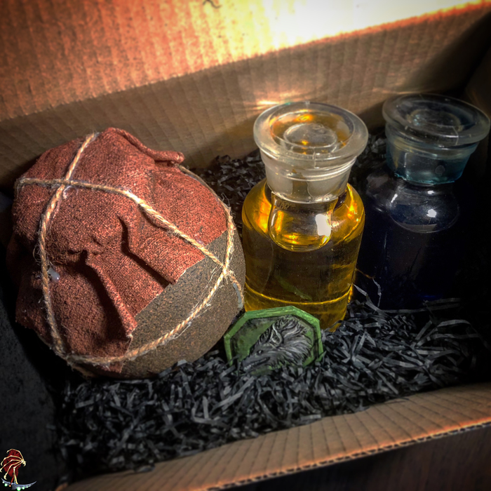В первый набор мы решили включить несколько простых вещиц: 2 фляги с эстусом (конечно же ими можно долбиться во время боссфайтов), огненную бомбу (она не съедобная, но то что внутри неё буквально подожжёт вас изнутри) и значок ковенанта. Для первого значка выбран был мой самый любимый ковенант - Сторожевых Псов Фаррона.