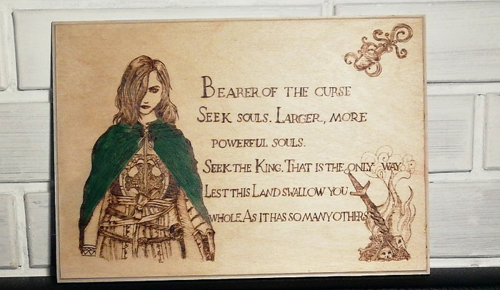 Получила я очень интересную просьбу - сделать картину (табличку? панно?) по Dark Souls 2. Что хотел видеть человек, он не знал, поэтому пришлось придумывать самой. Мой набросок с Изумрудным Вестником понравился сразу, и я приступила к работе