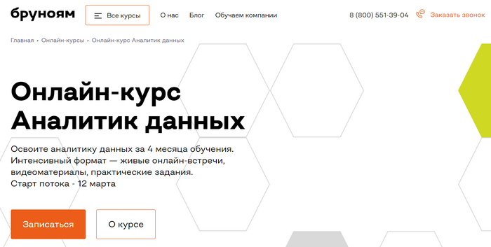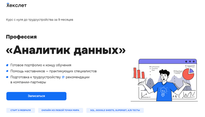 Особенности: до 9 проектов в портфолио, 2 специализации на выбор. Помощь в трудоустройстве. Выдаётся сертификат установленного образца. Курс Data Science подходит для новичков, программистов и начинающих аналитиков.