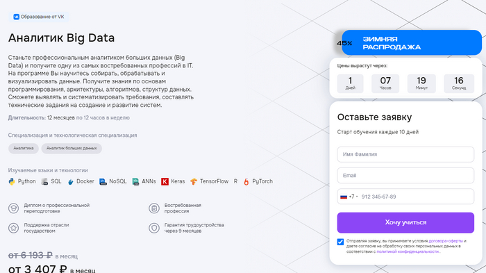 Специализация 1: Машинное обучение. Специализация 2: Дата-аналитик. Трудоустройство с поддержкой Центра карьеры.