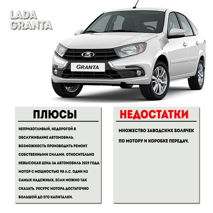 Плюс: неприхотливый, недорогой в обслуживание автомобиль. Возможность производить ремонт собственными силами. Относительно невысокая цена за автомобиль 2019-2020 года. Мотор с мощностью 98 л.с. один из самых надежных, если можно так сказать. Ресурс мотора достаточно большой до его капиталки.