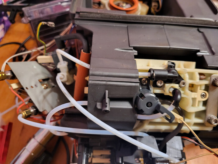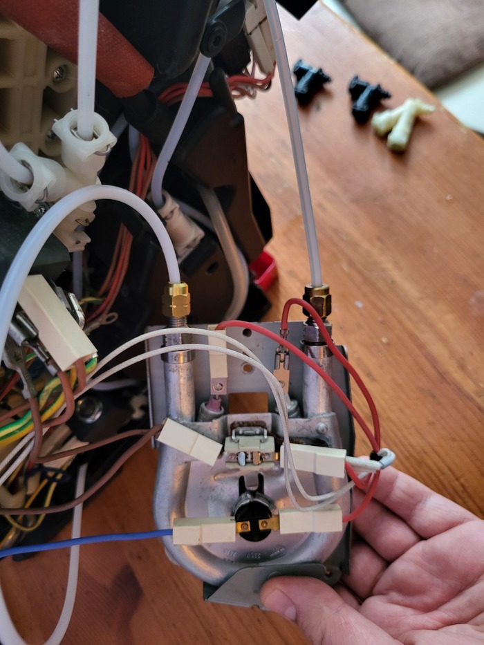 Заварник я тоже уже перебрал, заодно почистил диспенсер. Теперь все собираем. После декальцинации (требование которой все время горело на дисплее) я обнаружил, что отвалилась помпа. То есть декальцинацию она прошла, но потом умерла). Пришлось еще и помпу поменять.