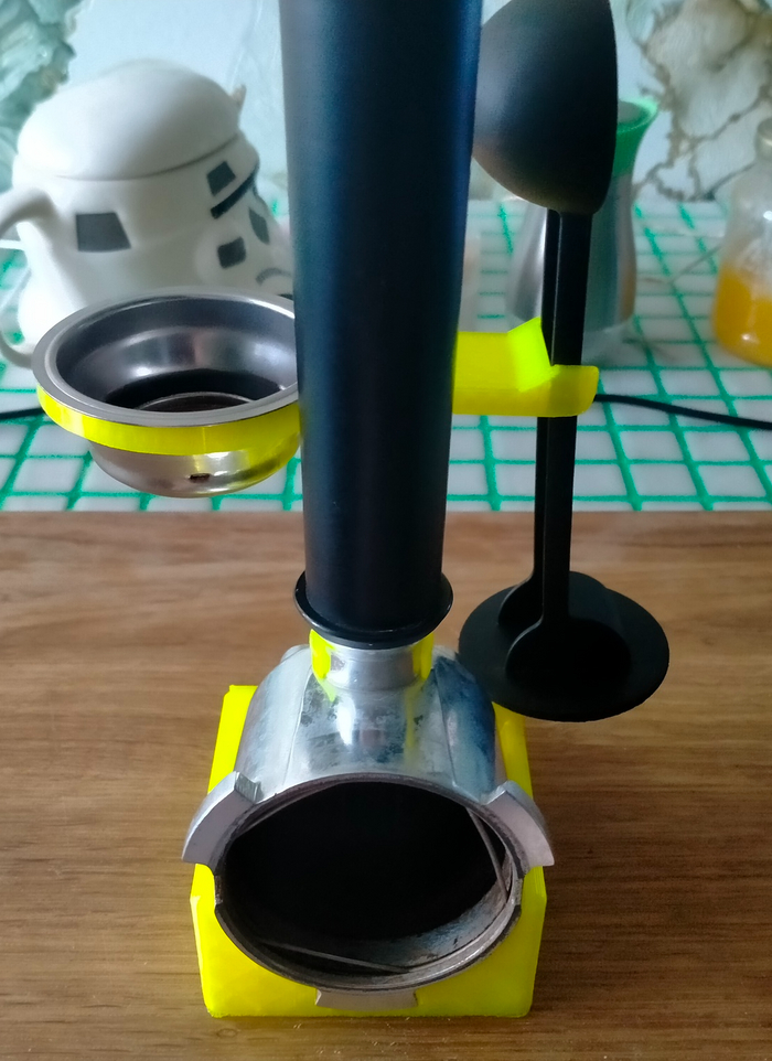Решил поставить рожок вертикально и состряпал версию два, хотя от первой взял верхнюю планку, для самого молотового кофе, и ложку с трамбователем. Как итог вышло лучше и по времени быстрее. Даже на дихлоэтан сажать не стал.