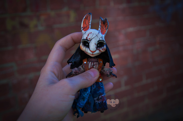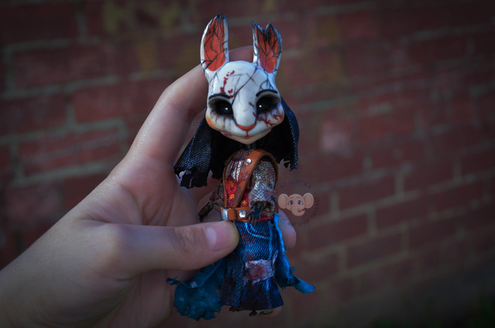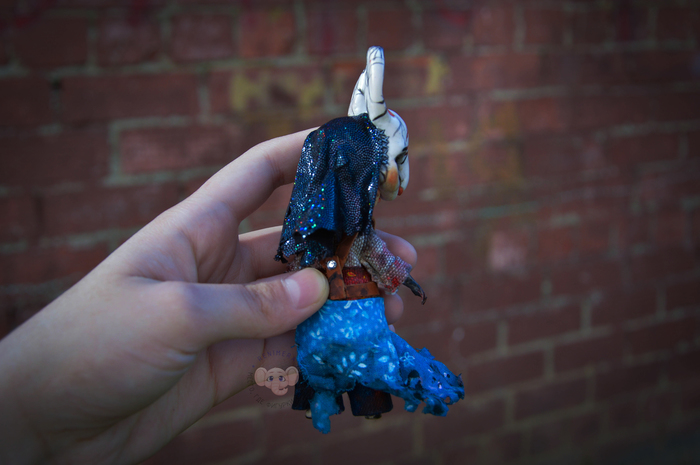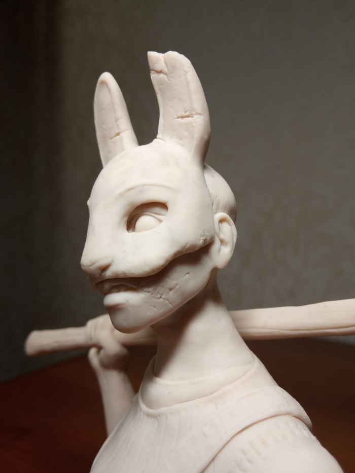 Фигурка выполнена в смешанной технике, с проволочным каркасом. Маска, ручки, и ножки выполнены из полимерной глины.