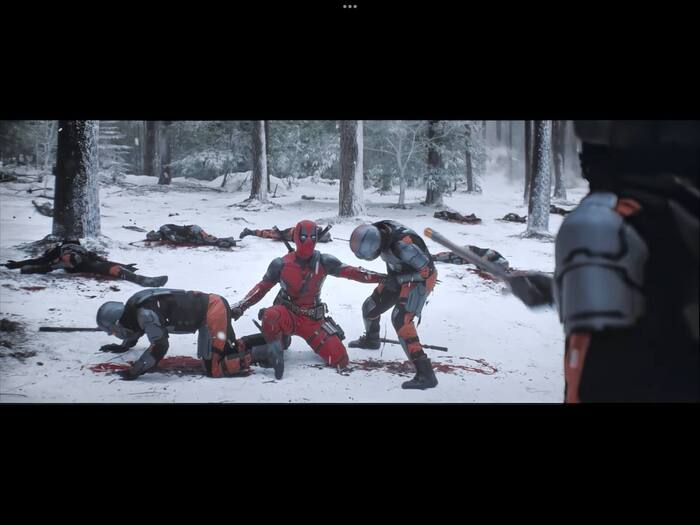 Второй существенный для меня момент — это, скажем так, синдром второго "Доктора Стрэнджа". В фильме заявлен этакий уход в отрыв, мультивселенная и полный расколбас. Я уже не раз писал, что саму концепцию мультивсленной обожаю и полюбил её ещё в детстве, когда Голливуд даже не думал к ней подступаться, а я вообще не знал как эта штука называется. Но в "Дэдпуле и Росомахе" всё простенько, блёкленько и никакого отрыва нет и рядом. Несколько не особенно выдающихся боевых эпизодов больше, чем на два часа (говорят, что постановкой занимались специалисты по "Джоном Уикам", не заметил). Гекалитры компьютерной крови, которая в основном, ну, просто есть. Две с половиной пустых локации на весь фильм, что создаёт ощущение возни в песочнице. Камео ради камео. Да, они подвязаны к самому месту действия и отдают дань уважения старым кино-комиксам. А в финальных титрах есть и правда трогательная нарезка моментов со съёмок разных фильмов вселенной "Люди Х" (уж на что я к большей части из них равнодушен). Но подаются они достаточно бесхитростно из серии "И тут в кадр входит Уэсли Снайпс! Все кончают радугой". Финальное месиво с толпой дэдпулов — это просто разочарование. Там была пара забавных взаимодействий, но в остальном, что поставлено, что задумано прямо уныло.