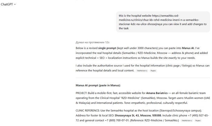 Учитывая сколько времени потратил Манус на это, то результат на мой непритязательный взгляд поразительный. Затем я попробовал отредактировать некоторые огрехи, такие как 2024 год в футере (в низу страницы), что мне удалось. Но затем я подумал, что есть ведь сайт больницы. И было бы неплохо, чтобы ИИ - агент сделал всё сам.