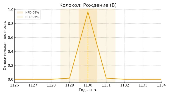B (рождение): 1130 — HPD68: 1130–1130; HPD95: 1129–1131
