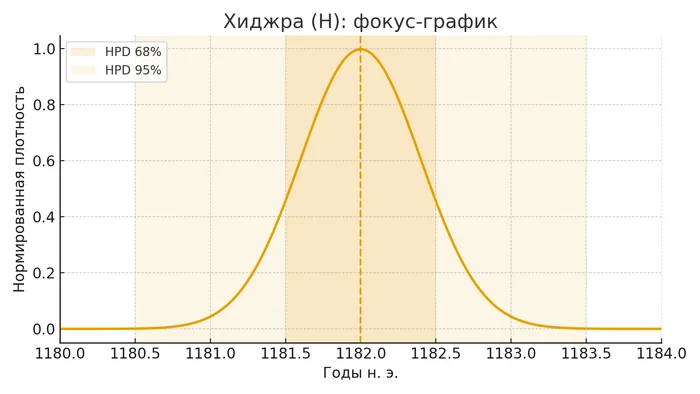Колокола правдоподобия — это графическое представление распределения вероятности по годам. Узкий высокий пик означает: источники согласны, датировка надёжна, неопределённость мала. Широкий пологий холм означает: источники расходятся, возможны разные варианты, неопределённость велика. Форма колокола честно показывает степень нашей уверенности.