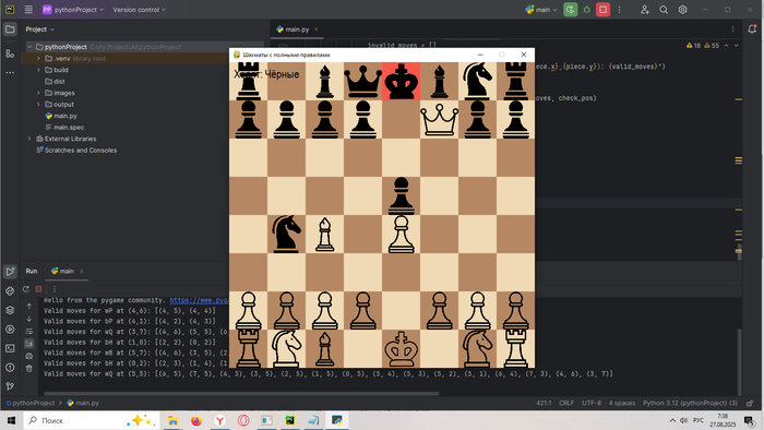 Было очень интересно узнать, как взаимодействовать с картинками в Python, что бы создавать какие-либо игры. Спросил у DeepSeek и под его руководством, добавил папку image в то же место, где и написан скрипт/код, а самим картинкам нужно было присвоить имена, которые будут прописаны в коде, достаточно по одной картинке каждой фигуры чёрных и белых. В коде может быть указан, как относительный путь, так и точный к папке image со слов DeepSeek. Пока шахматы получились на двоих, без игры с компьютером, но и это было не просто сделать, такому новичку, как я, который не учился на программиста. Первые коды игры, которые он писал, он не понимал, как должен ставиться шах/мат, с трудом получилось объяснить, помучился с правильным указанием пути к папке с картинками шахмат, а так же с размером фигур, что бы все попадали точно в клеточку и не вылезали за границу своей клетки.