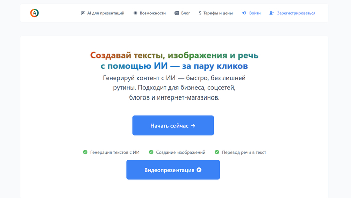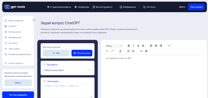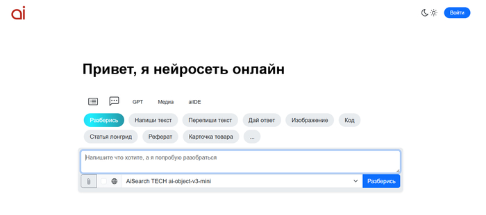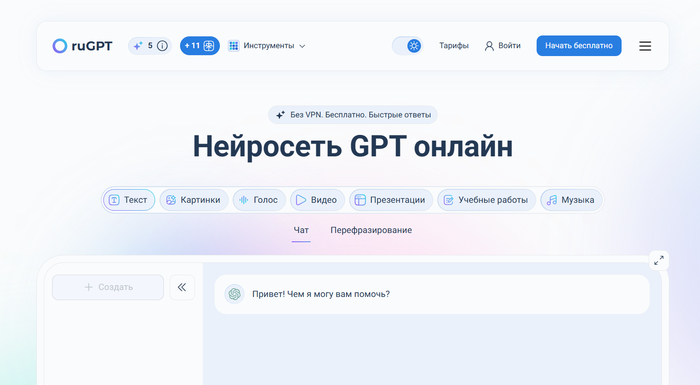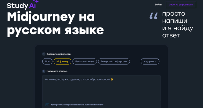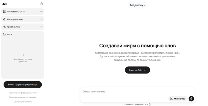 Российская альтернатива Midjourney, предоставляющая доступ к нейросетям ChatGPT 3.5, 4.0 и 4.0-mini. Сервис ориентирован на русскоязычных пользователей и предлагает широкий спектр инструментов для решения повседневных задач: от написания текстов и создания презентаций до генерации идей и проверки грамматики. Доступ к базовым функциям возможен без регистрации, однако для использования всех возможностей рекомендуется создать аккаунт.