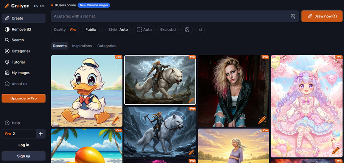 Бесплатный аналог Midjourney, ранее известный как DALL·E Mini. Он позволяет пользователям создавать уникальные изображения по текстовым описаниям за считанные секунды. Craiyon предлагает четыре основных стиля: «Фото», «Иллюстрация», «Рисунок» и «Вектор». Платформа доступна без регистрации, что делает ее удобной для быстрого и простого использования. Сервис поддерживает русский язык и предоставляет возможность генерировать изображения с разрешением до 1024×1024 пикселей. Для пользователей, желающих получить изображения более высокого качества, доступны платные подписки с дополнительными возможностями.