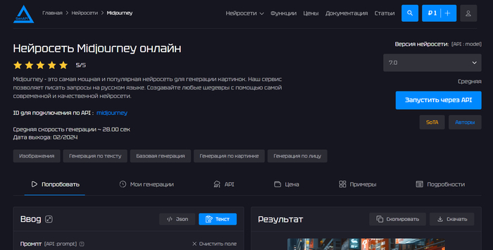 Русский аналог Миджорни, предоставляющий доступ к популярным нейросетям для генерации изображений, текстов, видео и аудио. Платформа поддерживает русский язык и предлагает простой интерфейс, позволяя пользователям без технических навыков создавать качественный контент. Процесс использования интуитивно понятен: необходимо выбрать нужную модель, ввести запрос и получить результат. Сервис работает без подписки, оплата производится за каждую генерацию отдельно, что удобно для нерегулярного использования.