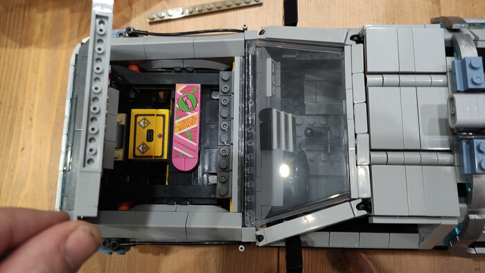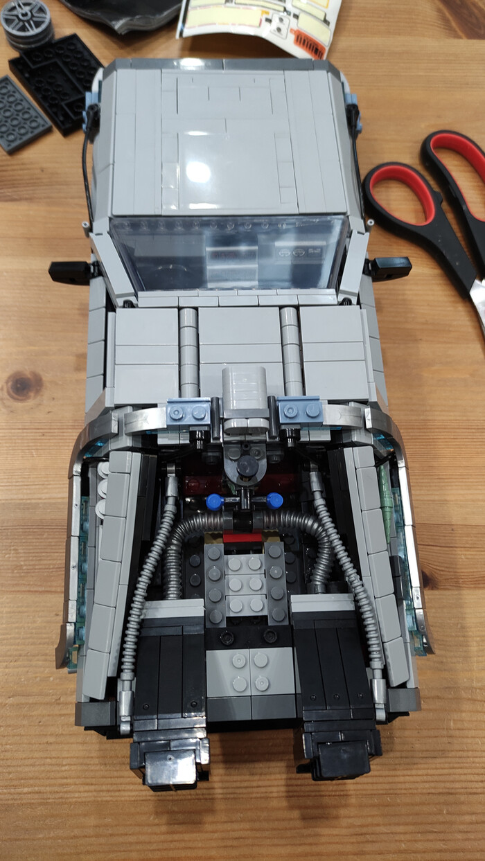 На девятом шаге заканчиваем сборку дверей. Двери открываются по принципу крыльев чайки, но к сожалению в открытом положении они не держаться. Вес двери тянет её вниз. На оригинальном наборе с дверями та же проблема.