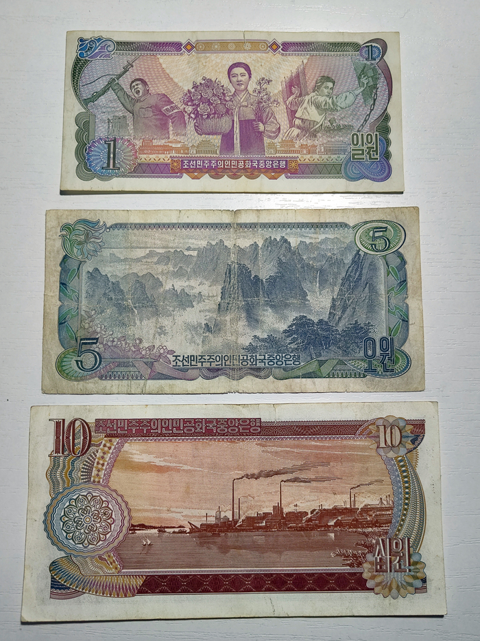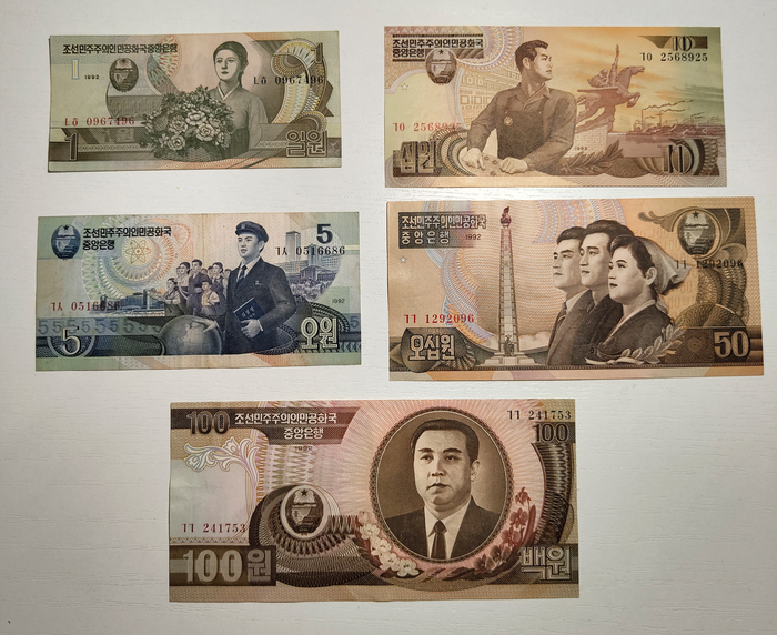 Дальше у нас купюры из 1992 года. Изображения — прям моё почтение. Причём если у СССР на рублях был только дедушка Ленин, то тут и рабочие, и учёные, и просто девушка в национальном костюме. На обратной стороне различные достопримечательности: горы Кымгансан, гидрокомплекс в Нампхо, Народный дворец учёбы, что около центральной площади Пхеньяна, гора Пэктусан и дом Ким Ир Сена в Мангёндэ.