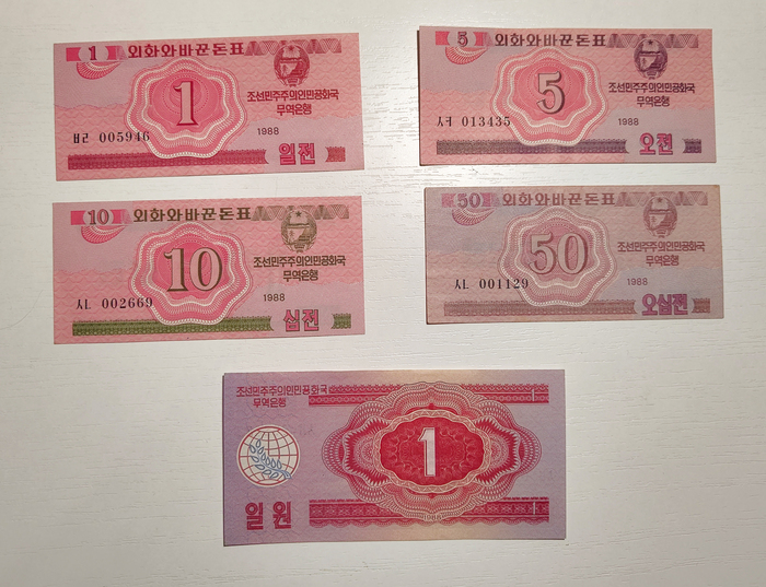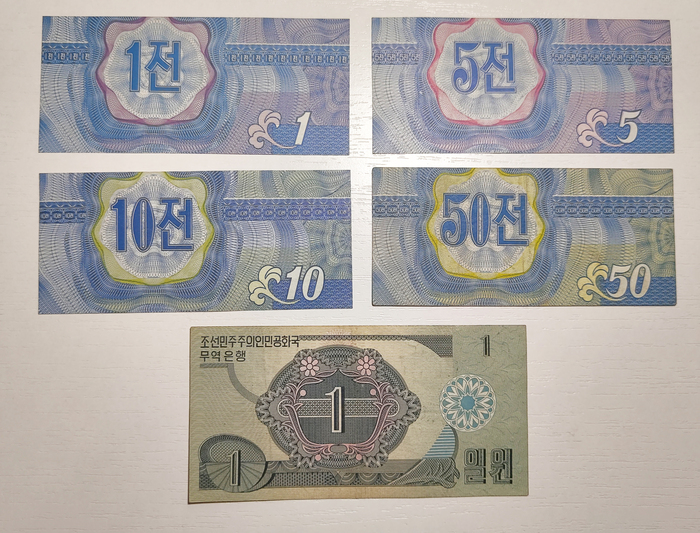 Собственно, вот они — красные деньги. Первые 4 банкноты — это чоны, т. е. копейки. Внизу уже 1 вона. Номиналы на 5, 10 и 50 вон отличались только цифрой, и таких у меня, увы, нет. Ещё на воне можно заметить глобус с оливковой ветвью, а на обратной стороне — музей подарков.