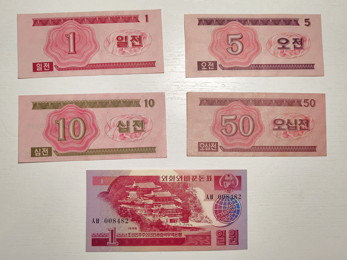 Ближе к делу. Местная валюта называется северокорейская вона. В Южной Корее, вы не поверите, тоже вона. Только, что очевидно, южнокорейская. Но про неё речь идти не будет, и дальше я буду просто писать «вона», имея в виду деньги из КНДР. Также есть свой аналог копейки — чон. 100 чон = 1 вона. Всё как у нас 😄