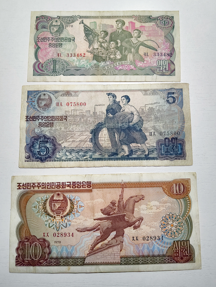 Несмотря на то, что иностранцам эти деньги иметь не положено... Ну, короче, вы поняли. Как именно их раздобыл мой отец, я уже не помню. Может, просто попадались в руки то там, то сям. Начнём с купюр 1978 года. Довольно неплохие и красивые банкноты, должен вам сказать. Надписи в основном гласят «Центральный Банк КНДР». Только на первой банкноте в 1 вону по центру внизу написано: «В этом мире нечему завидовать». Да, переводил через гуглопереводчик, так что он мог наврать. На последней деньге изображён Чхоллима — дальневосточный вариант Пегаса, который настолько быстр, что никто не мог его оседлать. Это символ того, что народ невероятно быстро восстанавливал свою страну после войны.