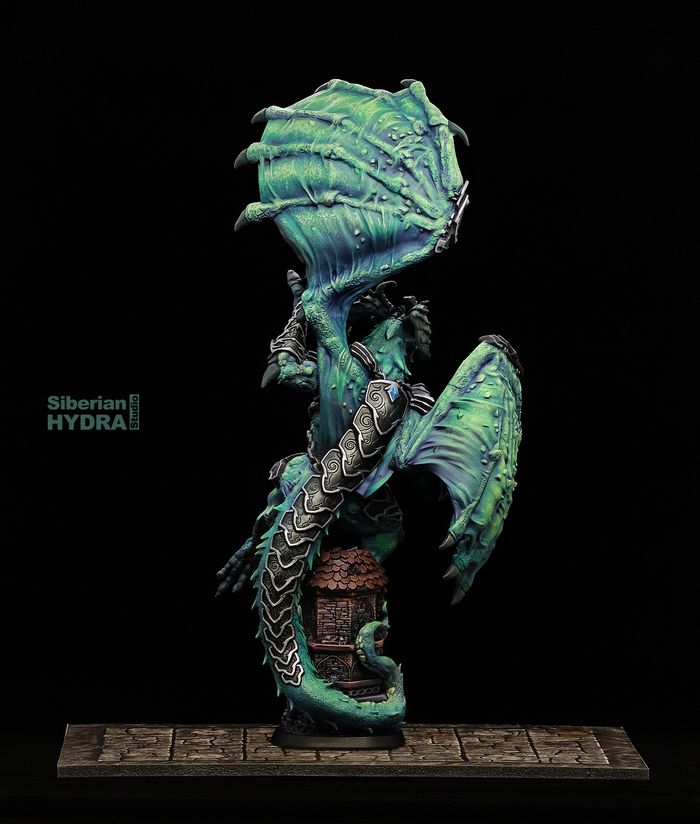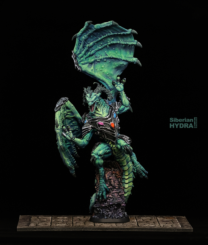 Фигурка дракона (Dragonlord Levirax) - самая крупная миниатюра игры, высотой 25,5 см. Вроде и прикольно переключиться покрасить крупный формат, но, учитывая, что фигурка не разбирается, доставила немало хлопот (аэрографом задула базовые цвета, после полностью детальная прорисовка кистью). За референс взят официальный арт дракона.