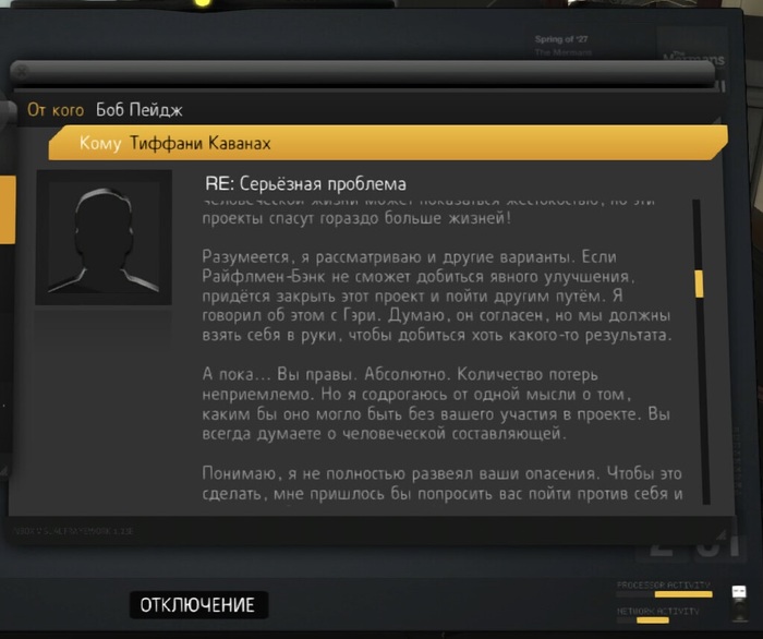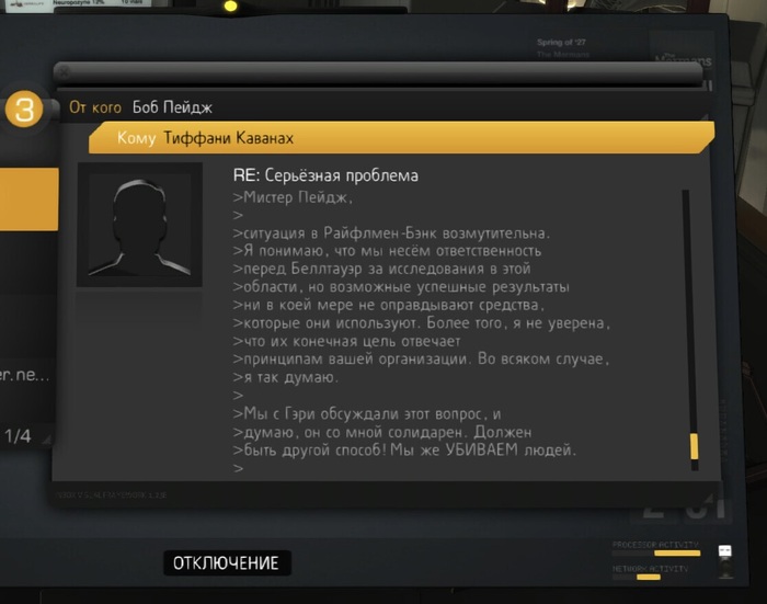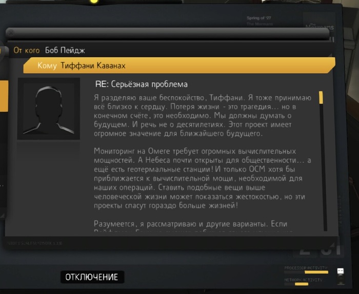 Далее следует шикарный ответ Боба Пейджа, который показывает, что он не зря занимает свой пост. Ответ сводится к тому, что: «Да, жертв много, и я опечален вместе с вами, но... кто если не мы? А если не мы, то жертв станет ещё больше. Поэтому вы совершаете благое дело». При этом Пейдж ловко надавил на человечность и сочувствие доктора Каванах, заверив, что она — ключевой специалист в работе. Всё очень культурно, вежливо и с пониманием. А если отбросить вежливость и посмотреть на текст сухим взглядом, то президент компании ни во что не ставит человеческие жизни. Он вскоре собирается открыть космическую станцию для богатых туристов, и только вычислительные мощности создаваемых на станции человеко-компьютеров способны потянуть стабильную работу всех систем.